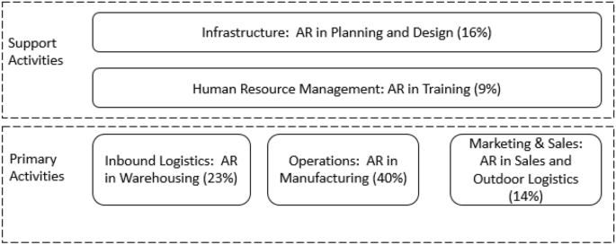 上图展示了AR在价值链分析中的应用,其中在支持活动中,AR在规划和设计(16%)以及培训(9%)中发挥作用;在主要活动中,AR在仓储(23%)、制造(40%)以及市场营销与销售和户外物流(14%)中均有应用。这表明AR在仓储环节的应用占比显著。