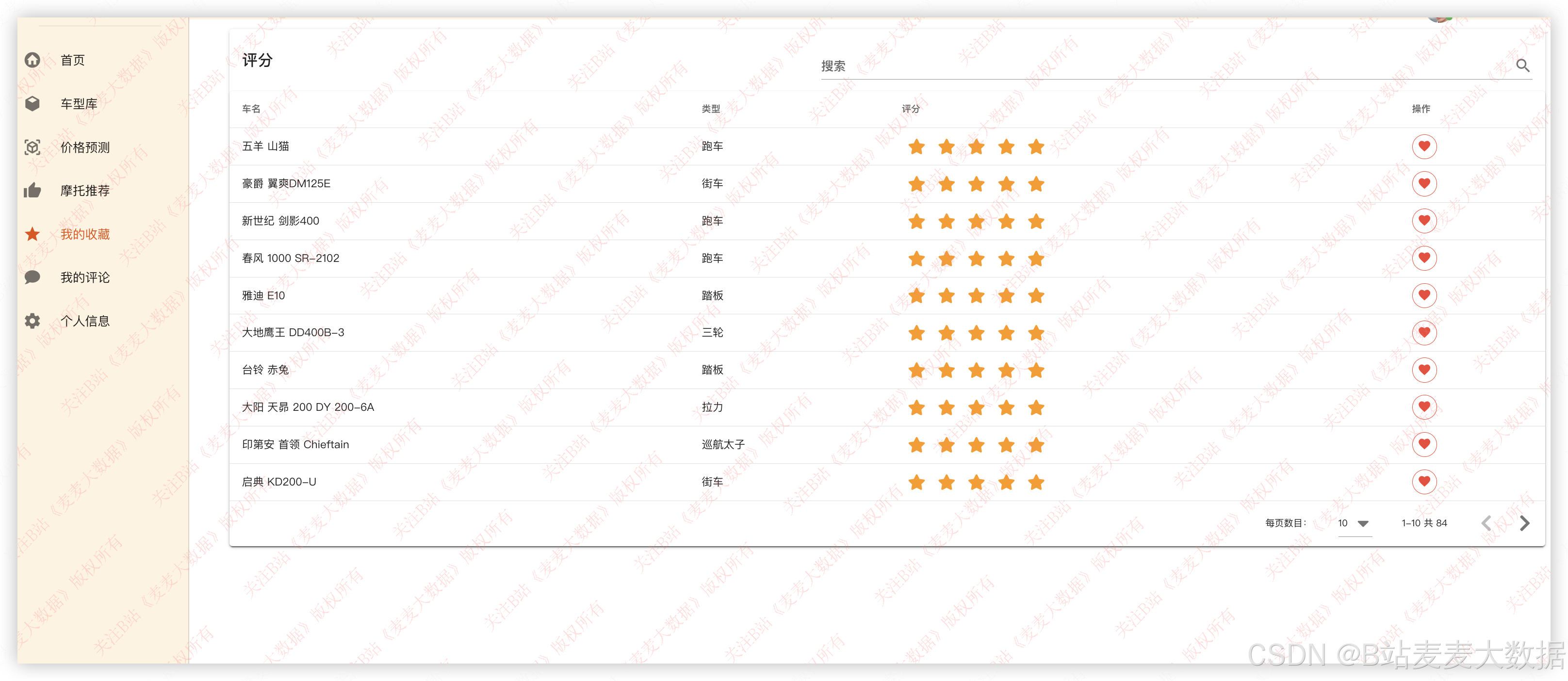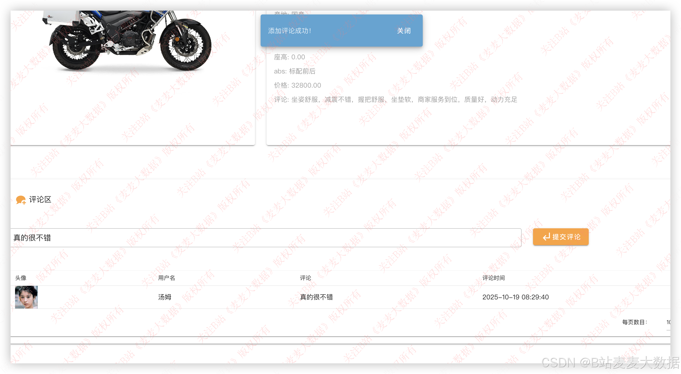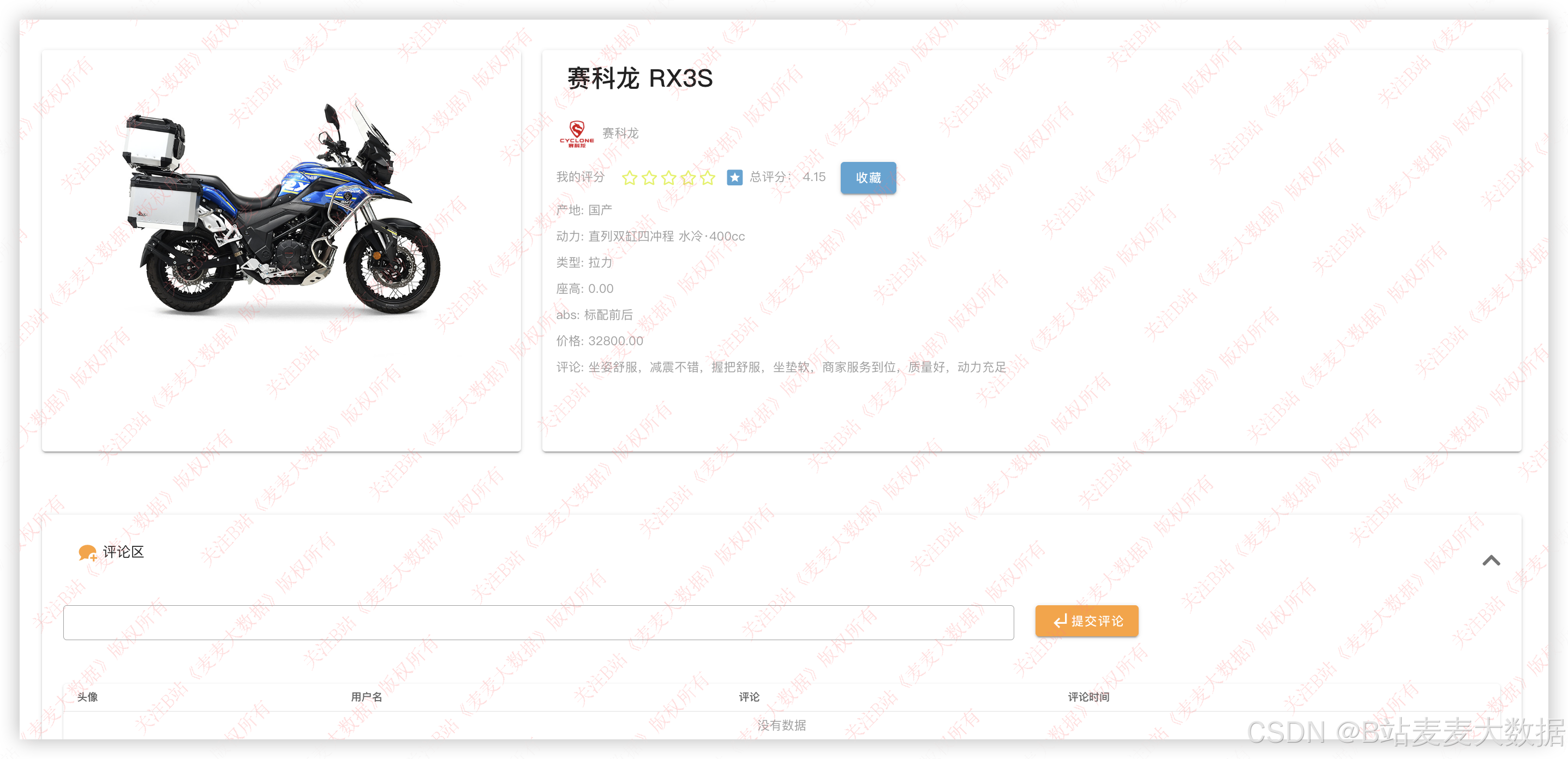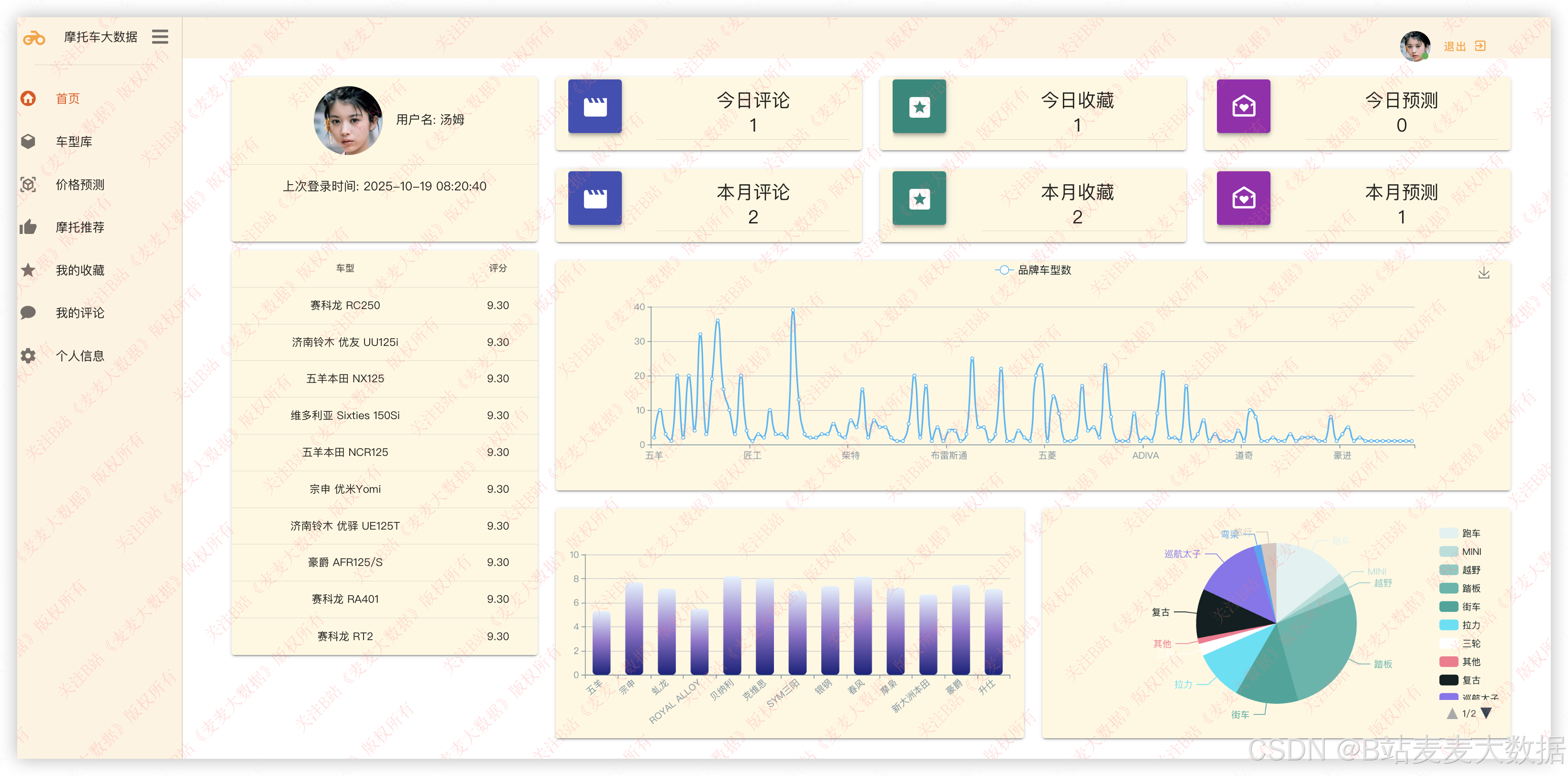 数据库:采用MySQL进行数据持久化存储,包括用户信息、摩托车基础数据、用户交互行为数据(如评论、收藏、评分)、预测结果等。