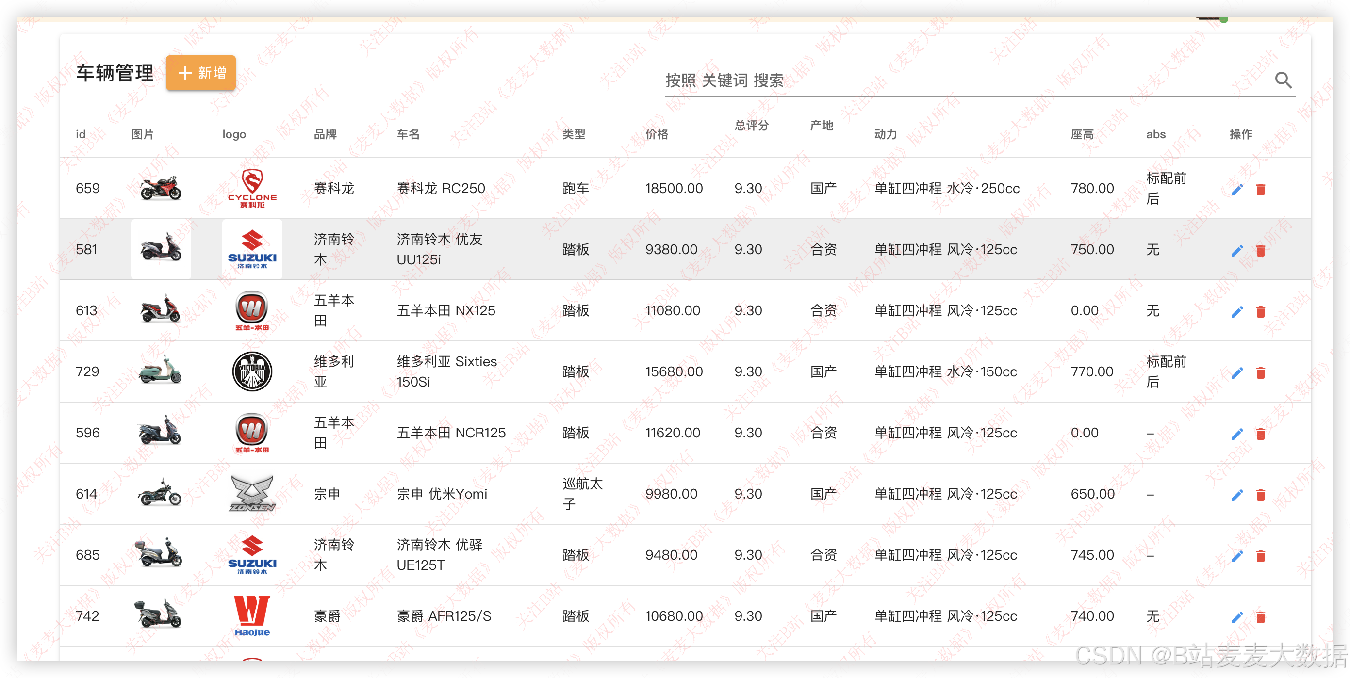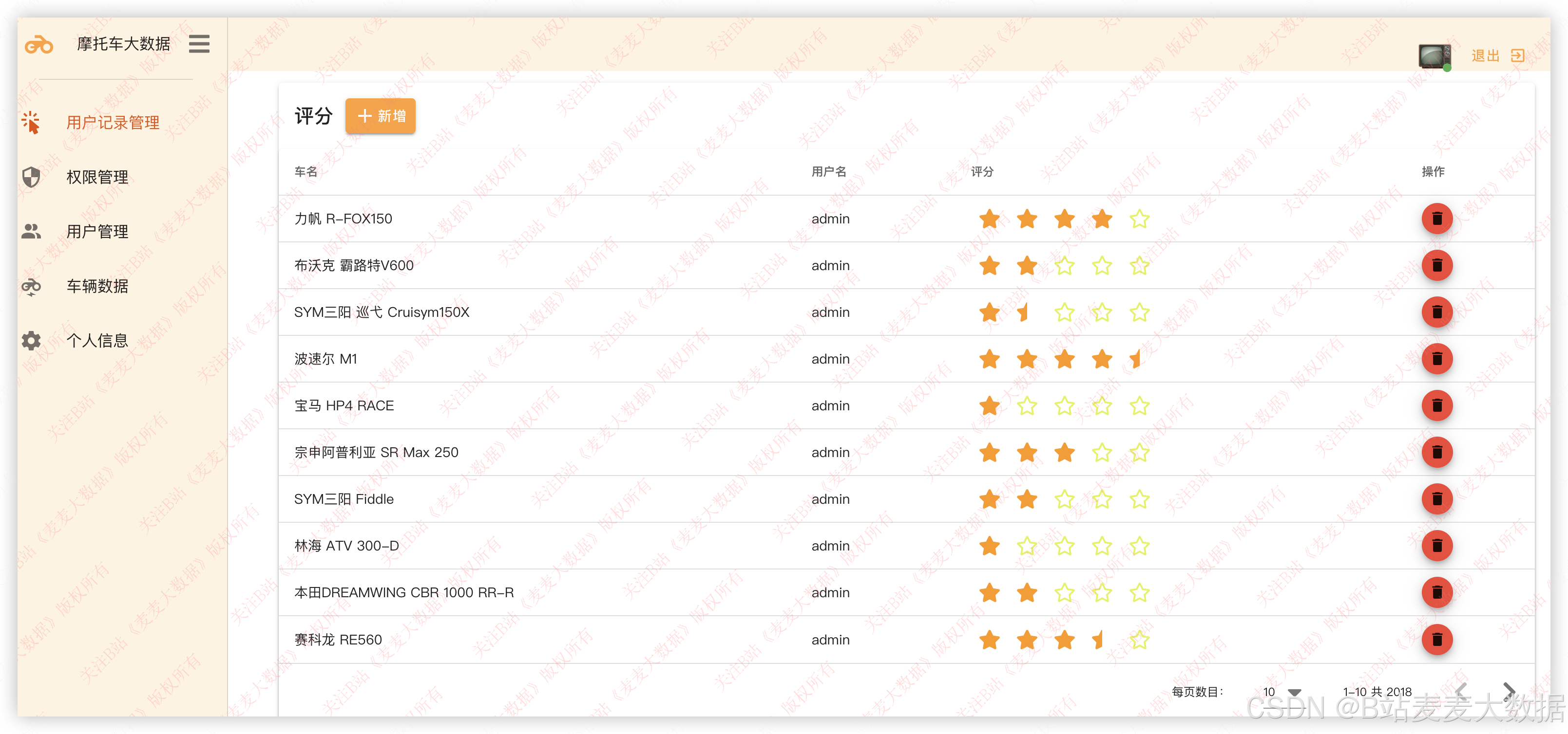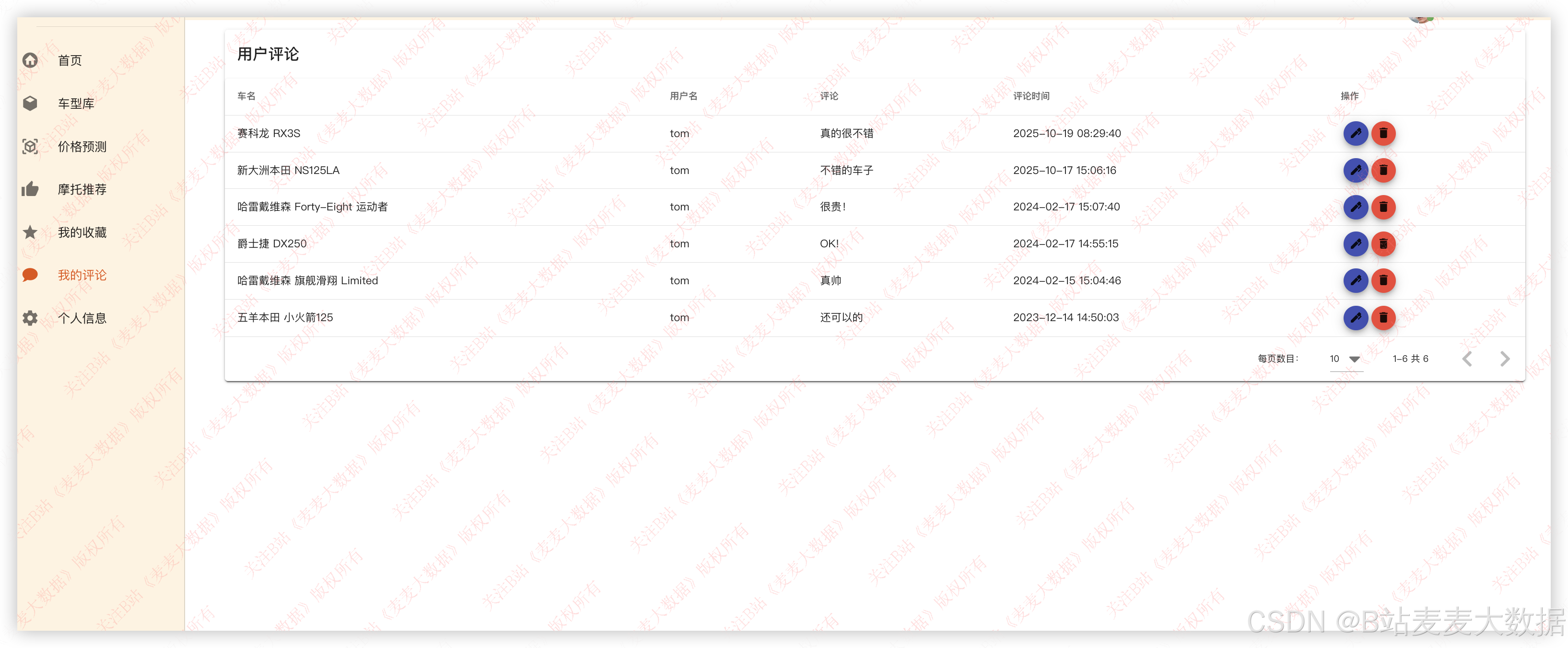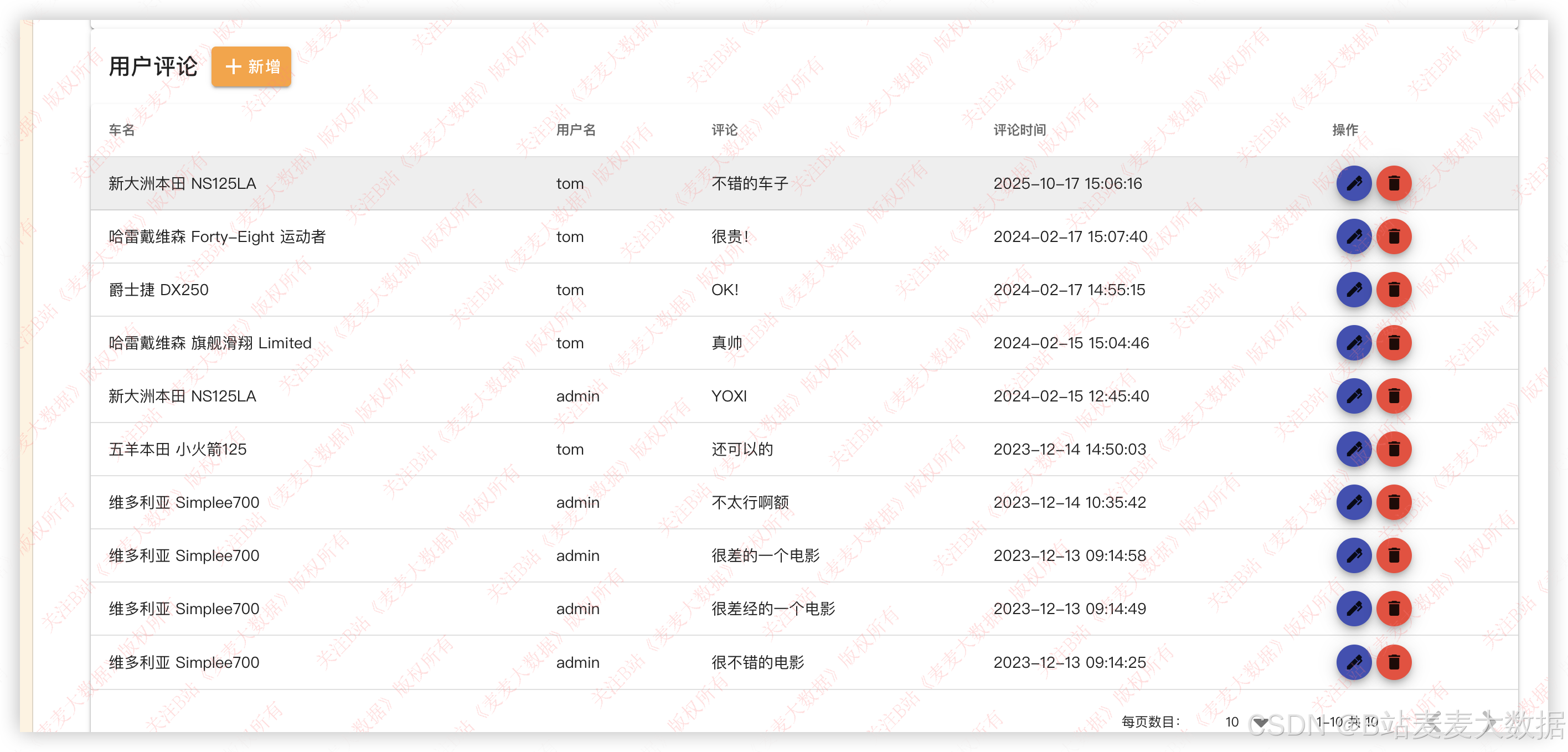 数据库:采用MySQL进行数据持久化存储,包括用户信息、摩托车基础数据、用户交互行为数据(如评论、收藏、评分)、预测结果等。