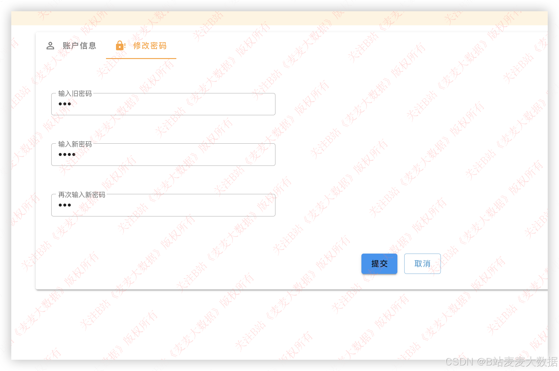 修改密码需要输入用户旧密码和新密码,验证旧密码成功后,就可以完成密码修改。