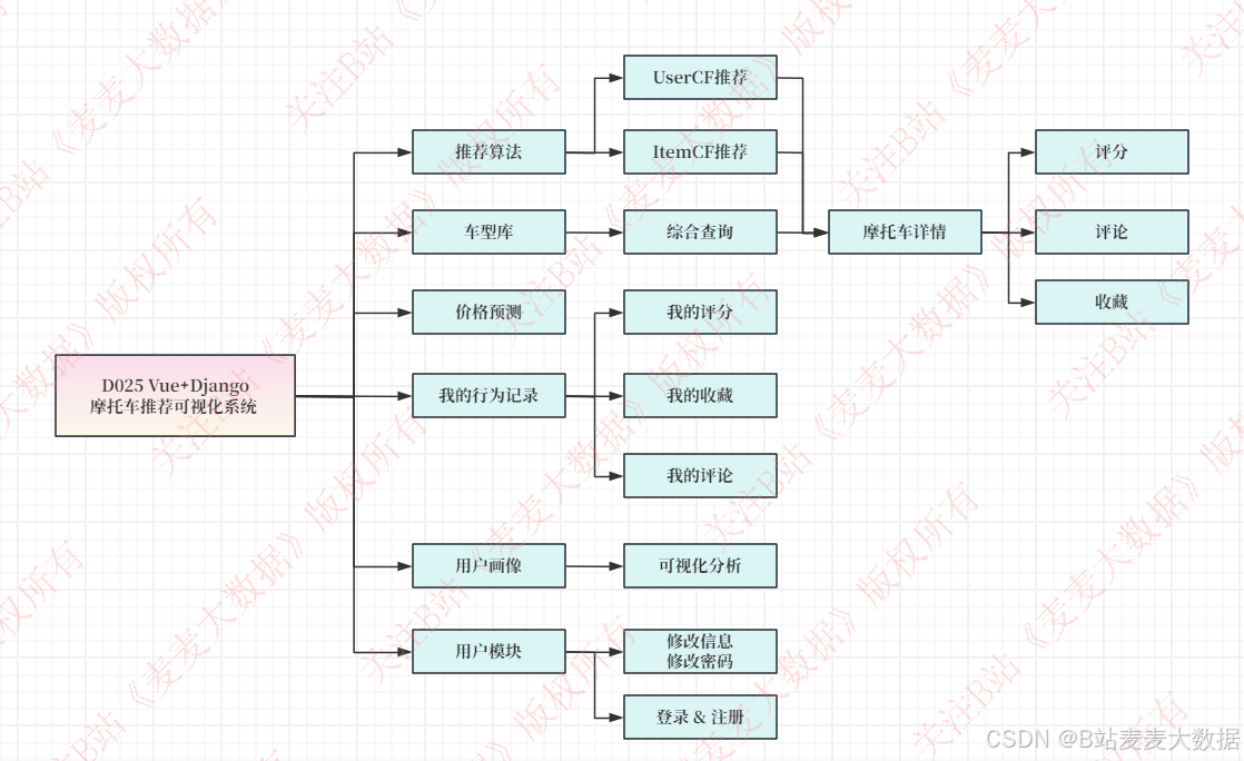 系统简介:本系统是一个基于Vue+Django构建的摩托车推荐价格预测可视化系统,集成推荐算法、机器学习模型和数据可视化功能,旨在为用户提供个性化的摩托车推荐和价格预测服务。系统的核心功能包括:首页展示、推荐系统、价格预测、摩托车信息查询、摩托车详情页面、用户画像及数据分析,以及用户管理模块。通过RESTful API实现前后端的数据交互,前端采用Vue.js生态系统(包括Vuex、Vue Router)构建用户界面,后端使用Django框架处理业务逻辑,MySQL数据库负责存储用户信息、摩托车数据和交互行为数据。系统还整合了数据可视化工具(如ECharts)以展示用户画像和预测结果,提升用户体验。