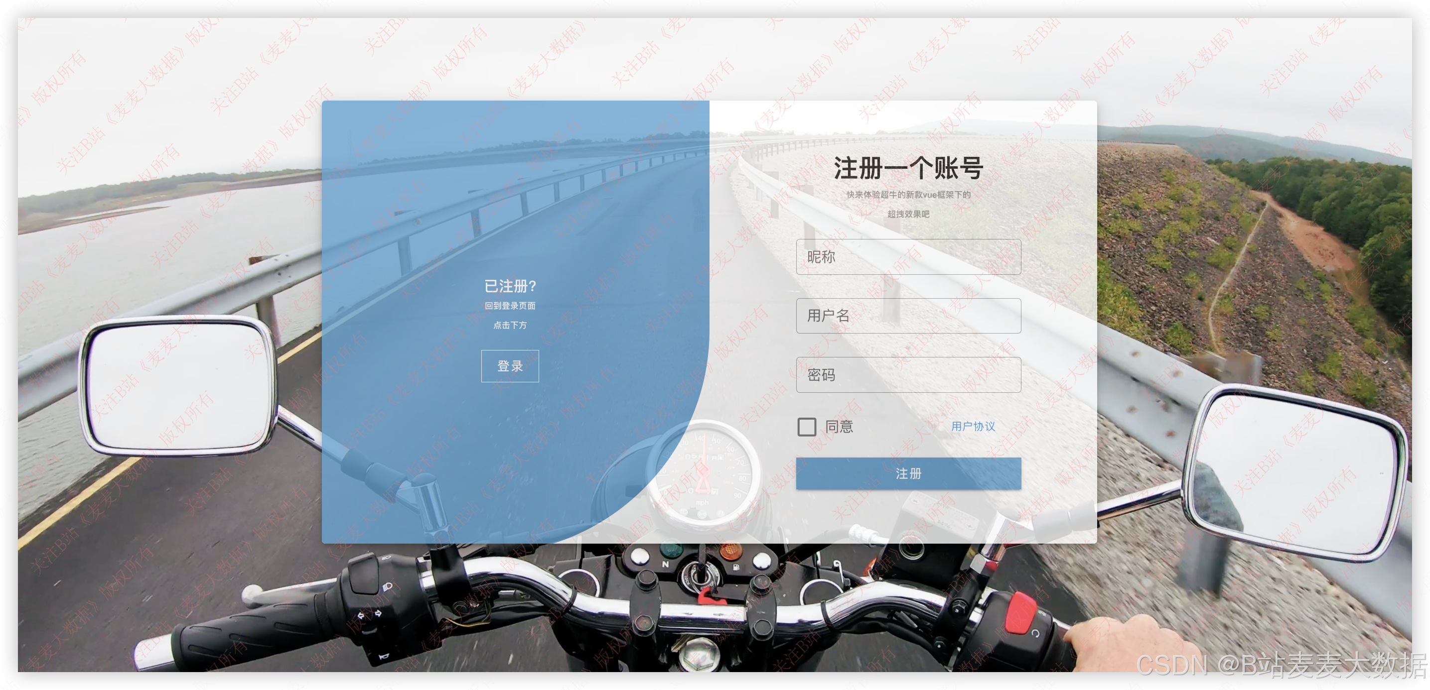 登录界面背景是一个视频,展示和本文系统主题相匹配的内容,登录和注册界面在一个界面下,通过按钮来切换,注册界面输入用户名和密码,会检查这个用户是否存在,登录界面则要检查用户名是否存在以及用户名密码是否正确: