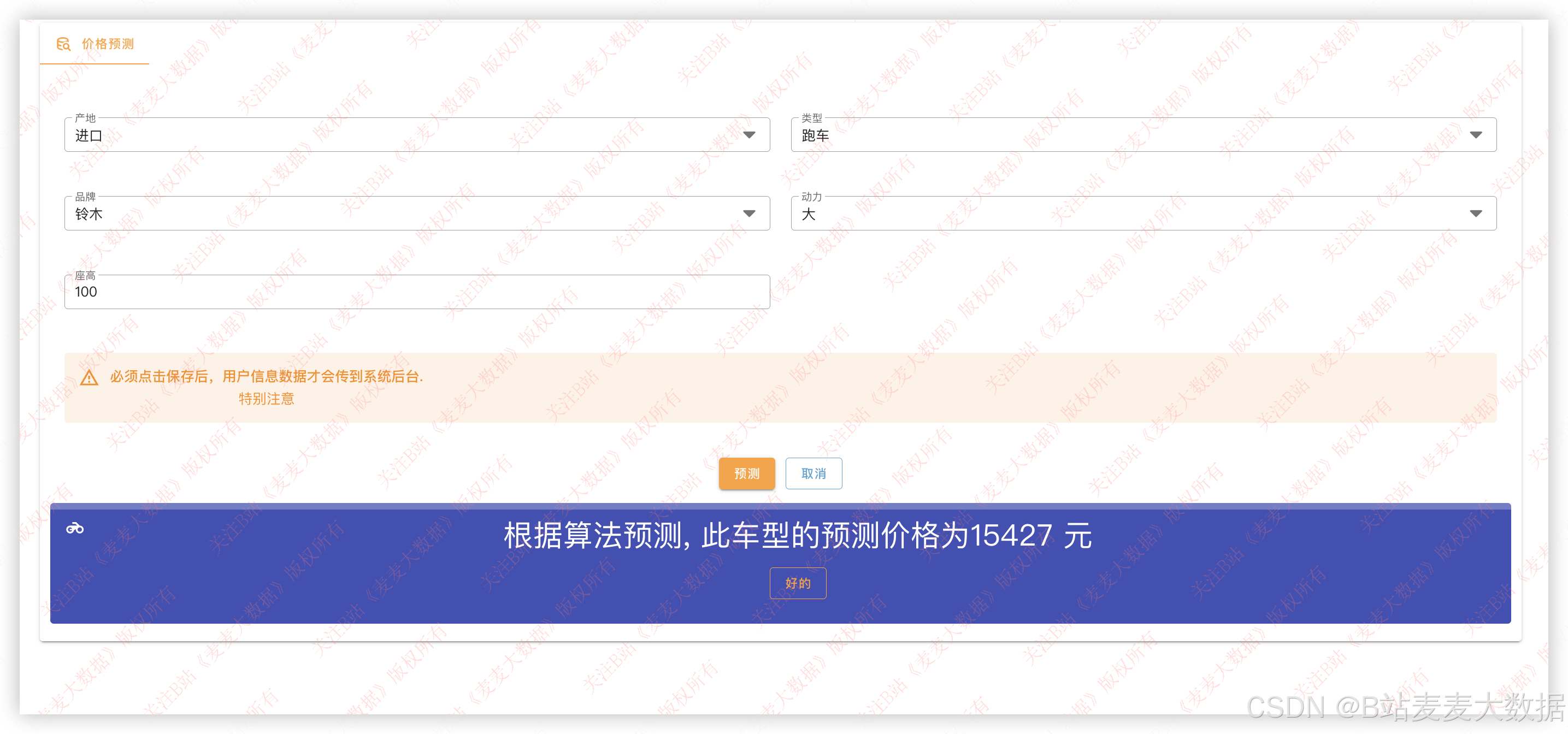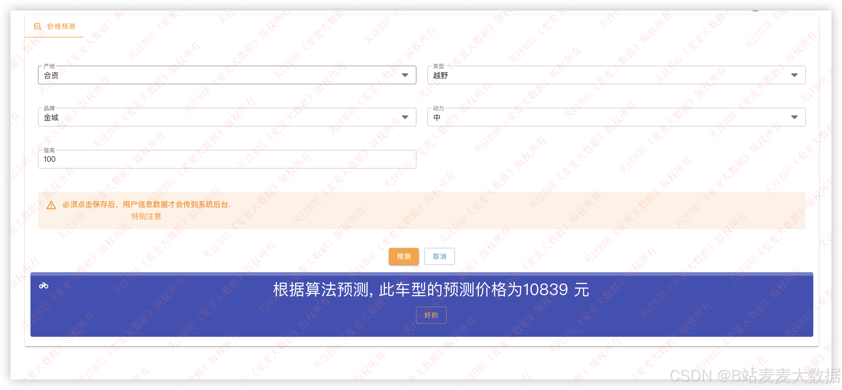 代码介绍:随着摩托车市场的快速发展,消费者在购买时面临着众多选择,价格预测成为用户决策的重要依据。本系统利用机器学习技术,通过分析品牌、是否进口以及排量等关键参数来预测摩托车的价格。品牌代表了制造商的技术实力和市场口碑,是否进口反映了产品的关税成本和市场定位,排量则直接影响着发动机性能和市场价格。系统通过收集和整理摩托车数据,利用回归算法建立价格模型,并通过训练和测试数据评估模型的准确性,最终为用户提供快速而准确的价格预测服务。该系统不仅帮助消费者做出明智的购车决策,也为二手车交易平台提供参考价值