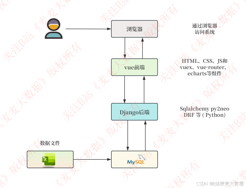 前端:基于Vue.js框架构建,使用Vuex进行状态管理,Vue Router实现路由导航,ECharts负责数据可视化图表的展示。