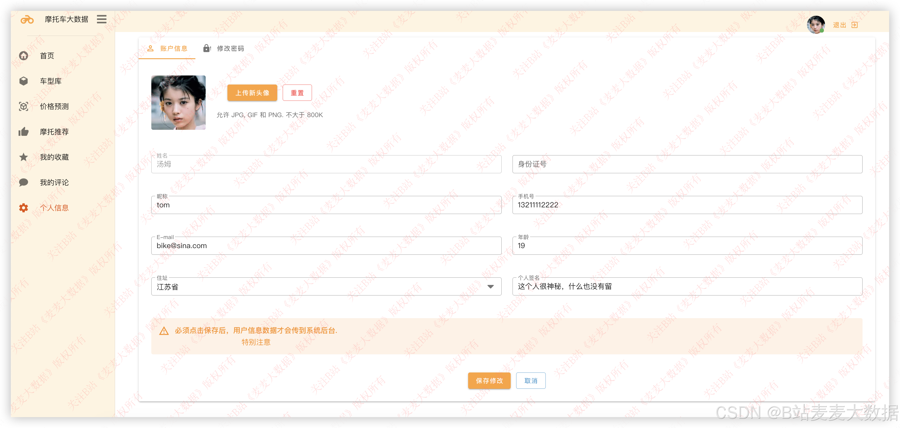 用户信息修改中可以上传头像,完成用户的头像个性化设置,也可以修改用户其他信息。