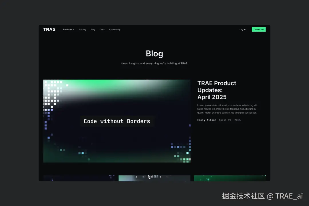 比如通过 TRAE 官网的 AI Coding 实践,设计师在交付阶段直接产出可运行的 React 交互组件,前端仅需简单调试与集成即可上线。相比传统的"静态稿+多轮返工",效果的开发周期由约 12 天缩短至 3 天 ,整体节省约 75% 时间,返工率显著降低,设计与研发的协作效率和落地成功率得到大幅提升。