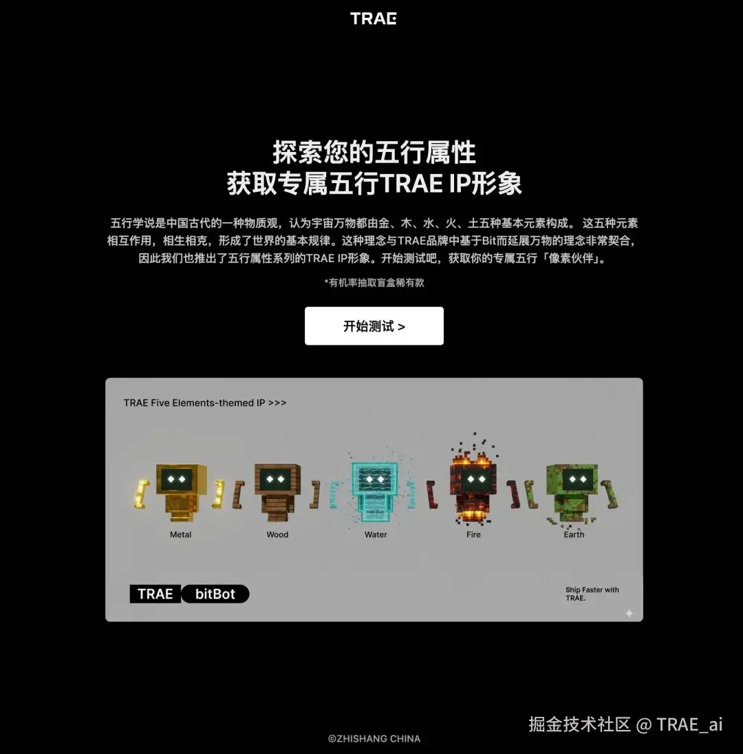 近期设计团队中五行八卦等玄学话题火热,同时设计师们也在设计探索TRAE的IP形象。因此尝试用 TRAE 开发了"探索您的五行属性,获取专属五行主题TRAE IP形象"的小工具,让用户可以在趣味测试中获得专属的"像素伙伴",提升TRAE品牌传播和影响力。