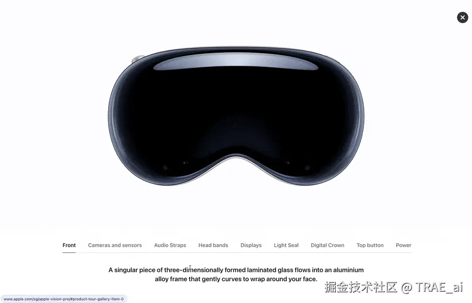 Apple Vision Pro 官网页面(www.apple.com/sg/apple-vi... WebGL 展示空间化交互,用户可旋转设备、多视角感受产品细节。