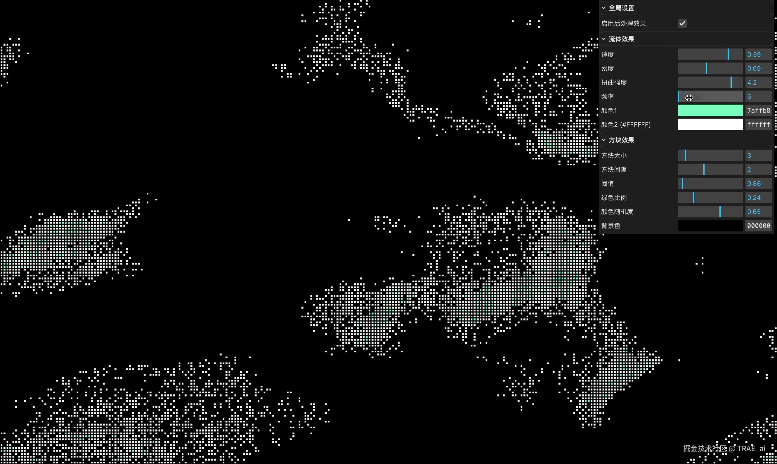 目前 TRAE 的大部分运营物料需要用到像素粒子效果作为背景,例如官网 Blog 封面以及功能引导动画等。为此设计团队用 TRAE 开发了一个像素粒子动画生成器,帮助设计师和运营同学快速调节视觉参数,生成个性化的粒子背景,提升视觉一致性和制作效率。
