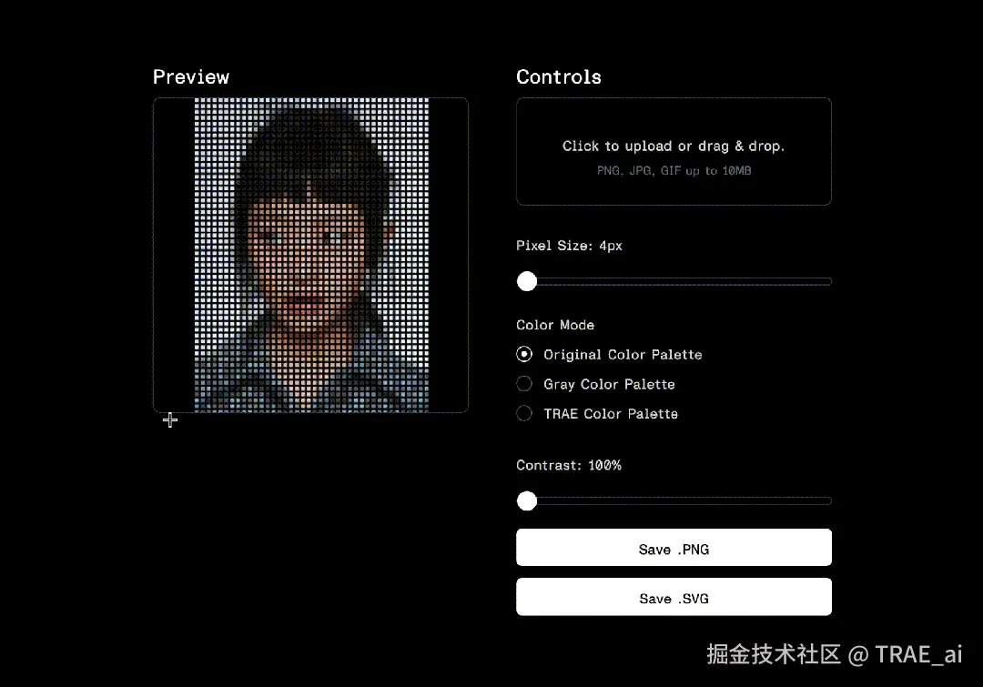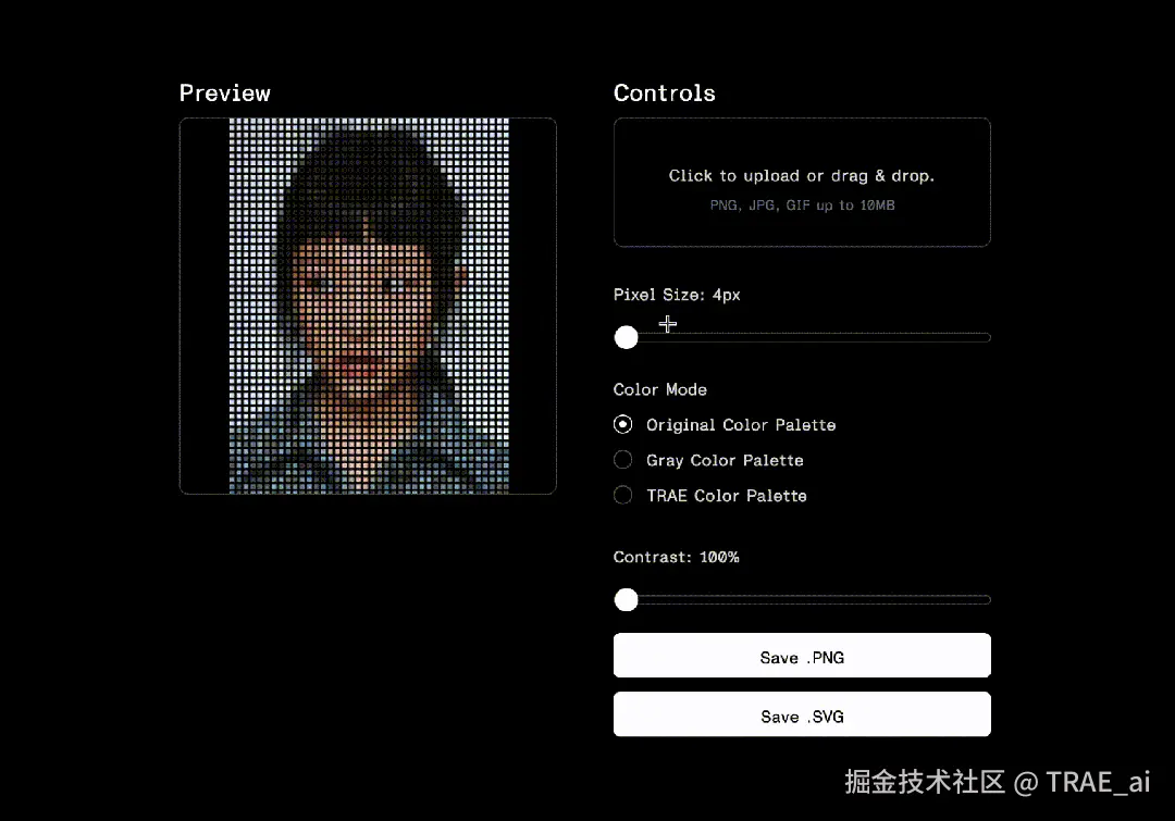 TRAE 2.0 全新上线,采用"像素伙伴"作为新的品牌视觉调性,设计侧尝试使用 TRAE 开发了一个像素风图像生成的小工具,可以生成 TRAE 色板的像素风图片。借助 TRAE AI 开发工具,能够直接生成→调试→发布一个设计小工具,让创意即时落地。