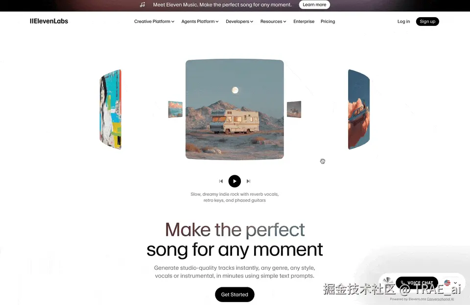ElevenLabs Music 产品页面(elevenlabs.io/music), 互动图形展示音乐可视化及多样性,以滚动揭示、加载/生成状态过渡,展示产品能力及易用性。