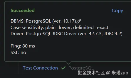- 回到数据库连接配置界面,此时 Driver 下拉框应该已经可以正常选择 PostgreSQL 驱动了。填写好连接信息后,点击 Test Connection,应该就能成功连接了。