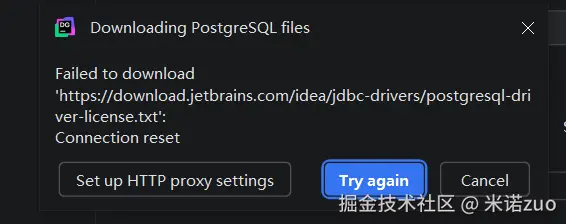 驱动下载: 第一次连接某种类型的数据库时,DataGrip 会提示你下载对应的 JDBC 驱动程序。通常只需点击 Download 或 Download missing driver files 按钮,DataGrip 会自动完成下载和配置, 如果出现一下错误,