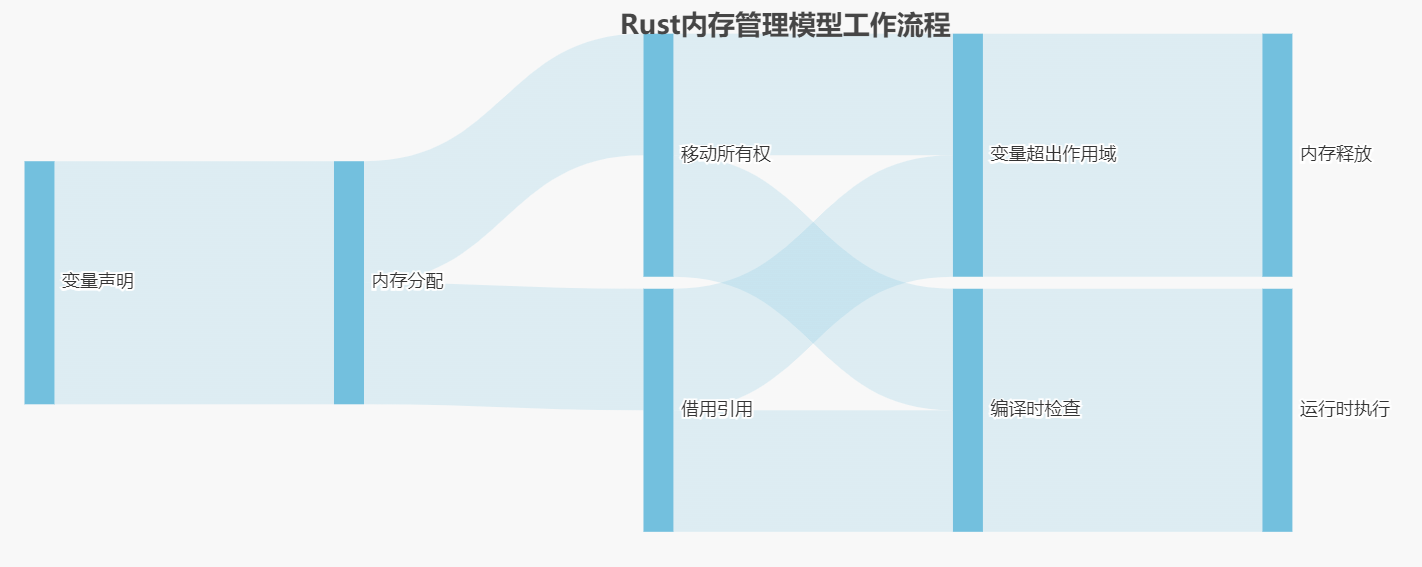 与其他语言不同,Rust采用了一种独特的内存管理模型,结合了编译时检查和确定性的资源释放。当变量进入作用域时,内存被分配;当变量离开作用域时,内存被自动释放。这个过程是通过一个名为drop