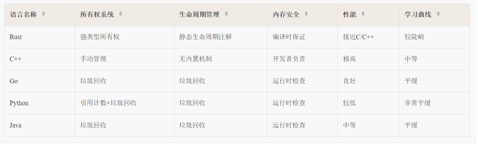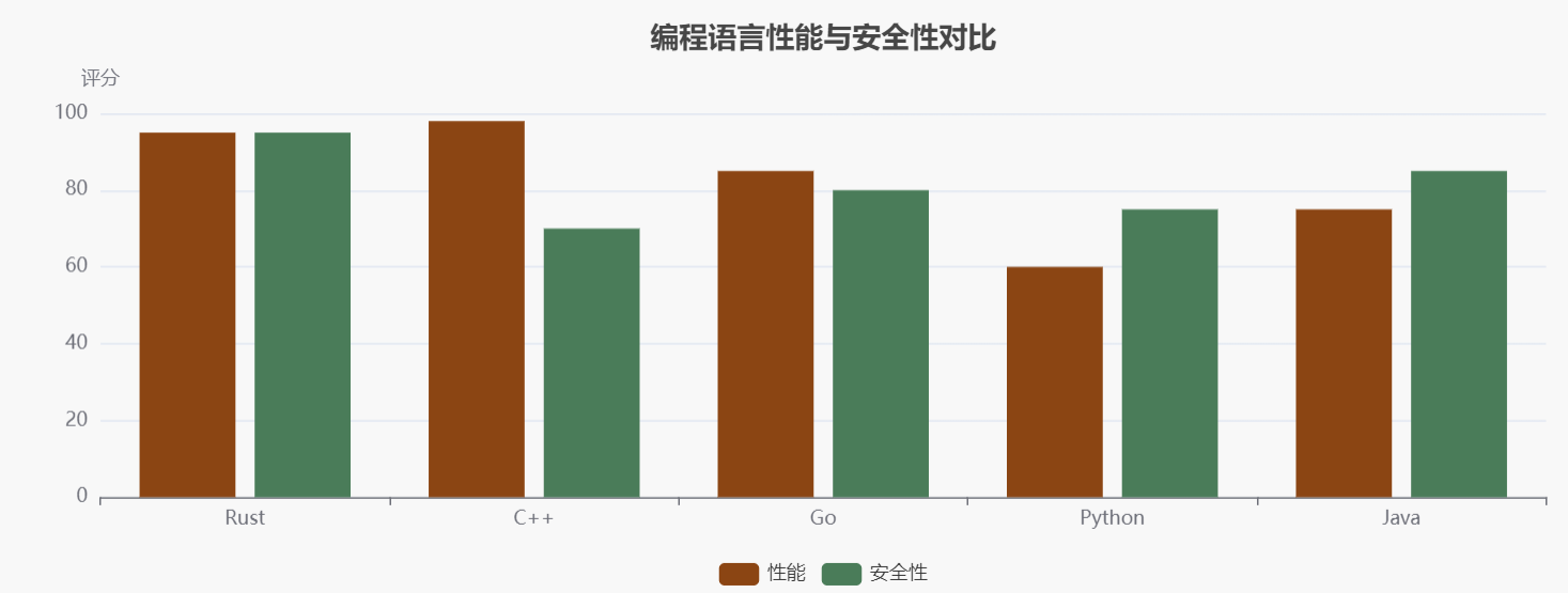 本文将深入探讨Rust语言的三个核心特性:所有权系统(Ownership)、生命周期(Lifetimes)和模式匹配(Pattern Matching)。这些特性不仅是Rust语言设计哲学的体现,也是Rust能够在编译时保证内存安全的关键所在。通过深入理解这些概念,开发者能够更好地利用Rust的优势,编写出高效、安全的代码。编程语言性能与安全性对比如下所示: