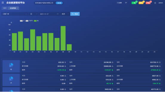 统计各个监测节点(工厂、车间)的当年、季度、月、周、日各类能源消耗费用,其中电包括峰电量、峰电费、谷电量、谷电费以及平均电量和平均电费。