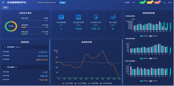 首页展示峰谷平用电、变压器情况、年能耗趋势、单耗趋势、分类能耗等企业级统计数据。