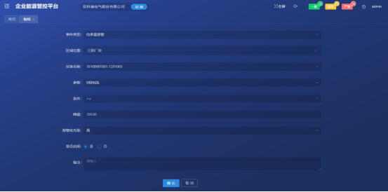 - 检测:对能源报警信息进行集中显示,可以对报警阈值信息进行相关处理操作,可以对报警参数进行在线设置,当能源参数越限报警,可提供报警重要性等级分类,具备APP推送、手机短信、邮件、钉钉、语音播报、系统弹窗等报警提示;