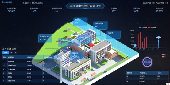 用户登录成功之后进入大屏展示页面,展示企业及各区域的能耗折标、产值、异常、排名、占比、通讯情况,点击区域展示该区域的分类能耗、产值等相关信息。