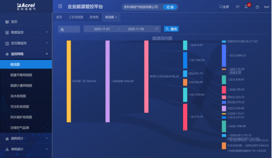 - 能源实时监控:对于水、电、气等能源消耗进行实时监测,确保用能环节的持续稳定运行,显示配电图、能流图、能源平衡网络图、能源计量网络图等功能。