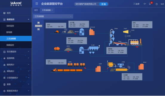 系统对区域、工段、设备能源消耗进行数据采集,监测设备及工艺运行状态,如温度、湿度、流量、压力、速度等,并支持变配电系统一次运行监视。可直接从动态监测平面图快速浏览到所管理的能耗数据,支持按能源种类、车间、工段、时间等维度查询相关能源用量。