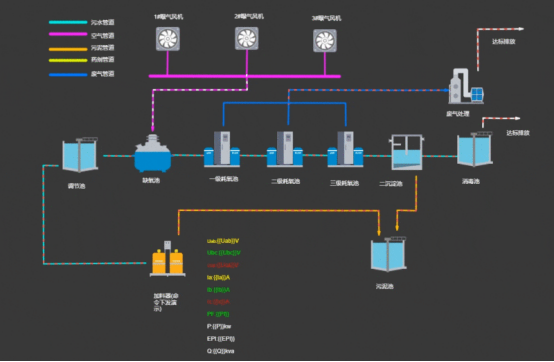 - 配电图:将配电房真实情况画入配电图,实时展示接入的门禁、水浸、电水气等仪表的实时参数、门禁水浸状态及能耗数据。