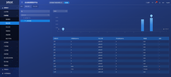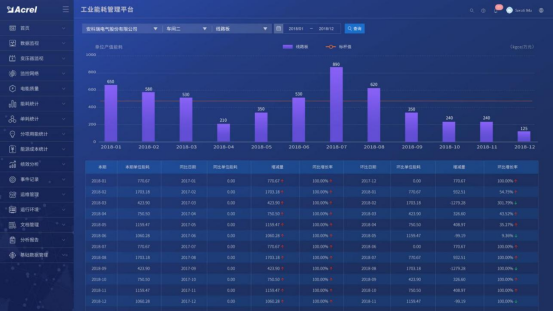 从能源使用种类、监测区域、车间、生产工艺、工序、工段时间、设备、班组、分项等维度,采用曲线、饼图、直方图、累积图、数字表等方式对企业用能统计、同比、环比分析、实绩分析,折标对比、单位产品能耗、单位产值能耗统计,找出能源使用过程中的漏洞和不合理地方,从而调整能源分配策略,减少能源使用过程中的浪费。