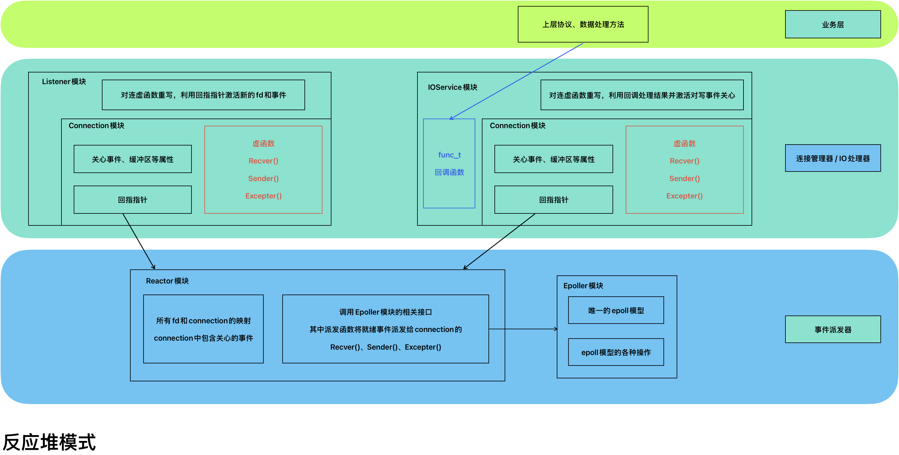 这和之前poll和select的代码及其相似,通过派发器,reactor会将就绪的事件派发给不同的connection,而这些connection就是Listener或者IOService模块,不同模块会重写自己的Sender(),Recver(),Excepter()函数,实现多态。