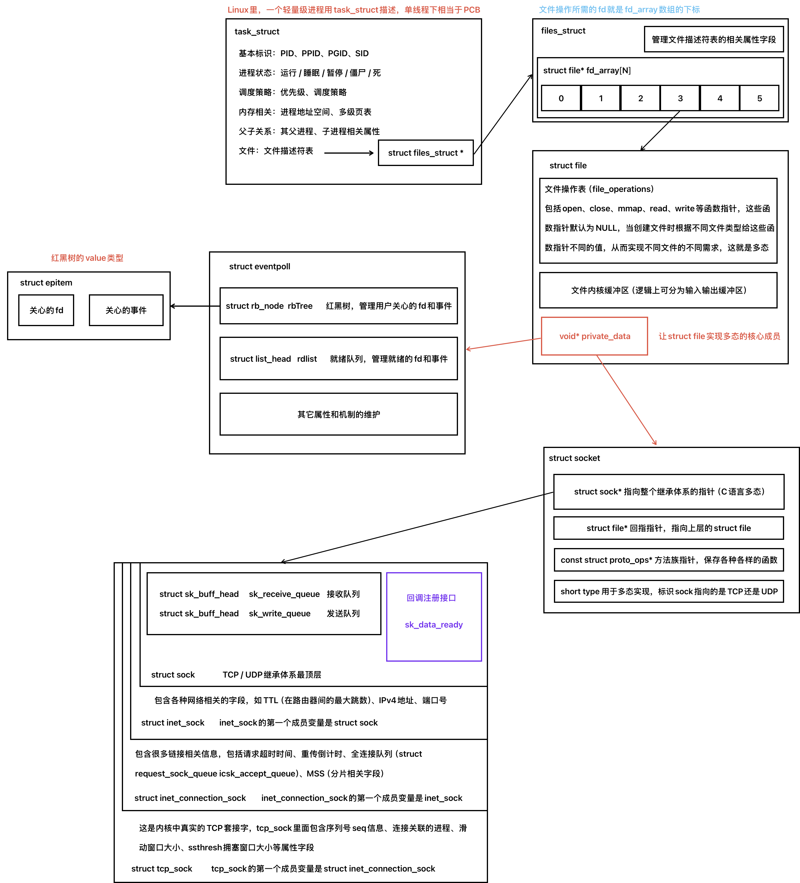 如上图,当创建一个epoll模型时其实是创建了一个struct file和struct eventpoll,该file的private_data和我们的struct eventpoll进行关联,因此创建epoll模型返回的其实是一个fd,Linux网络内核和struct file也是这样关联的!Linux下一切皆文件,这也是C风格多态的体现!