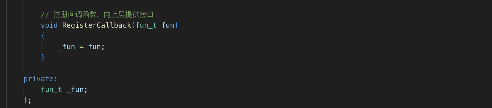 在反应堆模式中,IOService对应的connection负责和客户端通信,Recver()主要负责三件事:接收数据、处理数据、激活写事件。 其中处理数据就是调用一个默认为空的fun(),并且IOService对外提供一个设置fun的接口,上层可以通过这个接口传入任何函数,而下层都会去实现,这个就是上层向下层注册服务。 通过这种方式,我们实现了处理数据操作和处理方法之间的接耦,将IOService变得更加通用了。