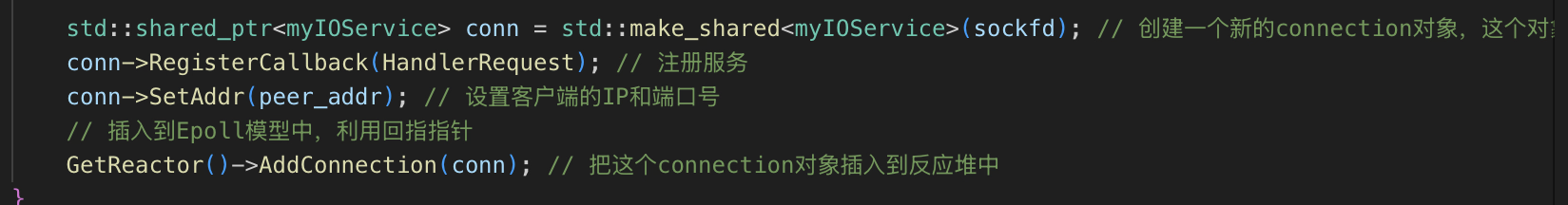 回指指针!connection里面有着指向reactor的回指指针,当Listener得到连接并创建IOService之后,它直接用基类的回指指针指向下层,进入下层,并调用下层reactor里面的成员函数,将新连接写透到epoll模型中。