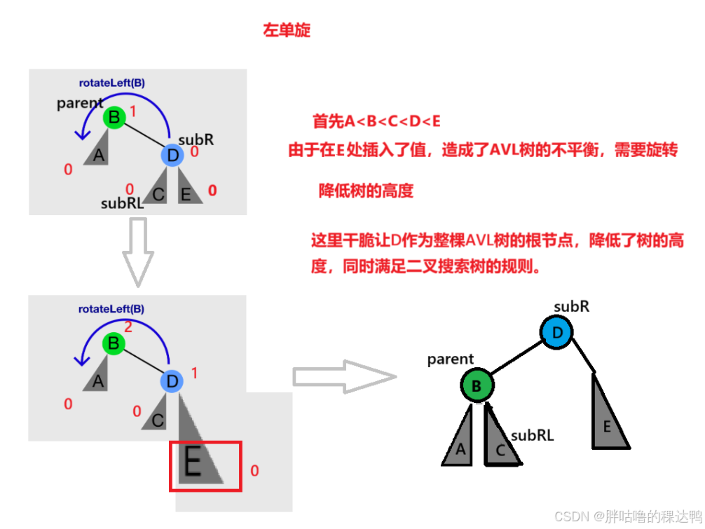 先进行左单旋:插入节点subLR部分太高了,右边太高往左边旋转变平衡,降低树的高度,这一部分将以父亲节点的根为旋转点,parent->_left,可以直接调用左单旋的代码,rotateLeft(parent->_left),