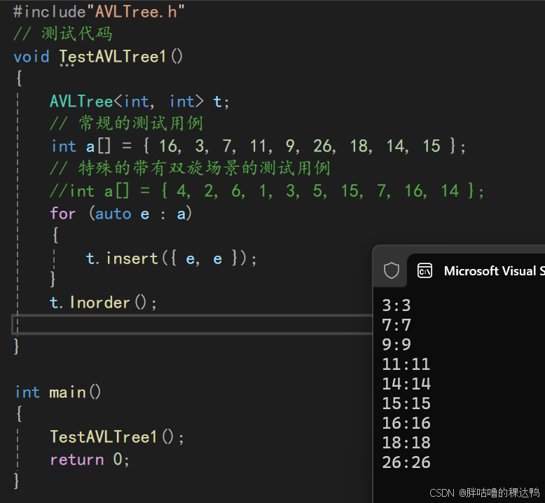 定义一个AVLTreeNode的构造函数,参数是一个 pair<K,V>类型的常量引用kv,用于初始化节点的键值对数据。对_left,_right,_parent这些指针初始化为nullptr,表示当前的节点初始化没有左节点,右节点,父节点,平衡因子是0.表示初始化节点的左右子树高度相同。