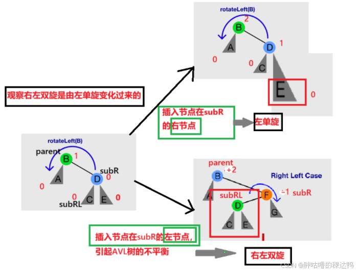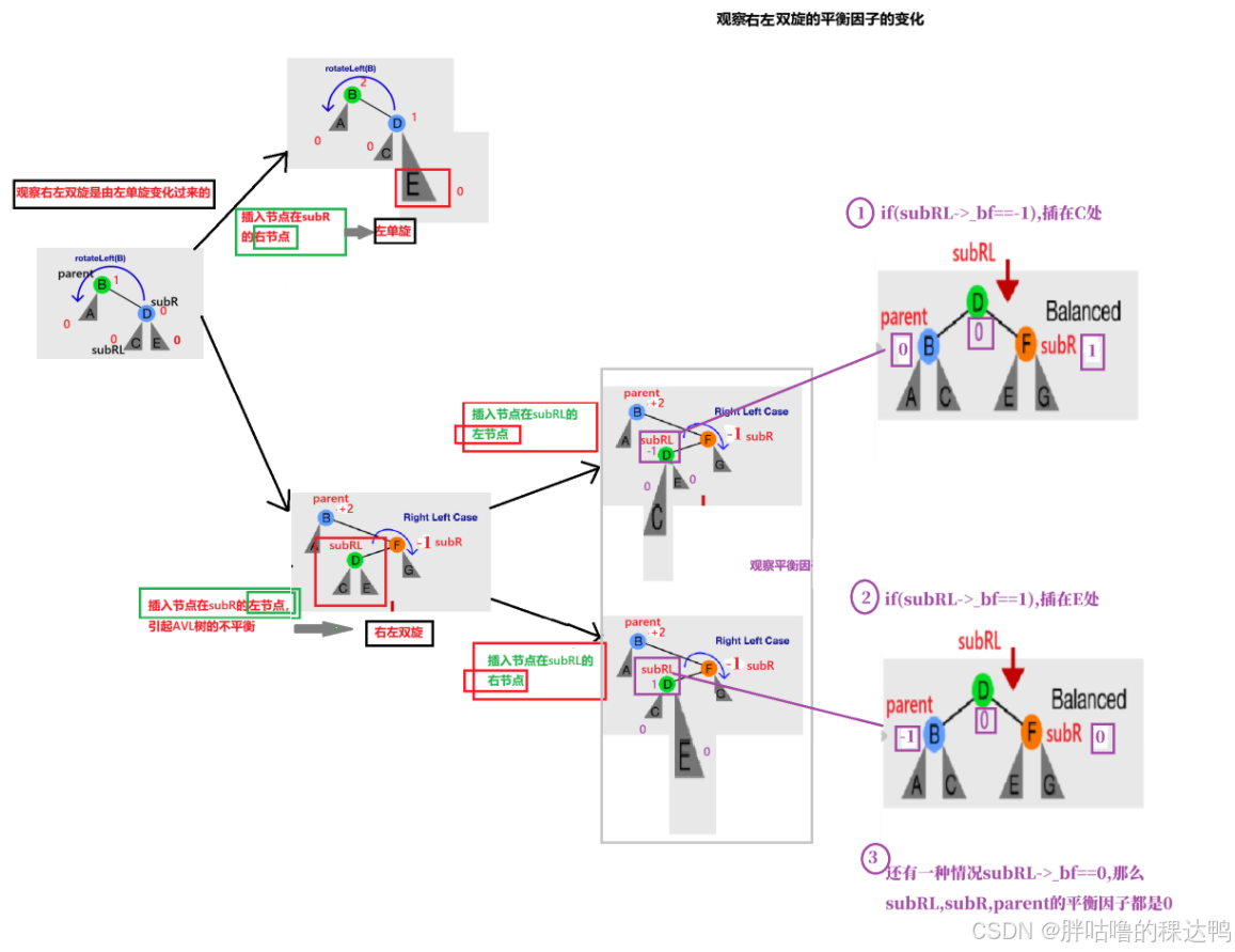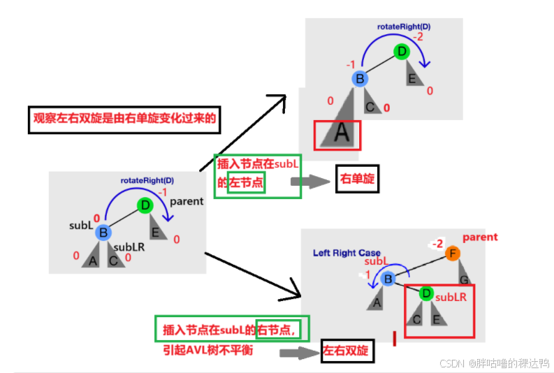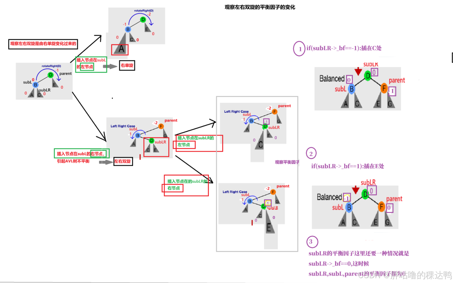 如果subLR的平衡因子为-1,那就说明插入的节点插入在C的位置,