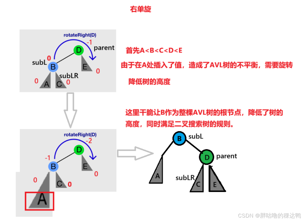 这里看图画的很清楚,首先要给节点命名,Node* subL=parent->_left,subL作为parent的左子树节点,Node* subLR=subL->_right,subLR作为subL的右子树节点,旋转的时候,让parent->_left指向subLR。至少图中是这样子完成右单旋的。实际上,图中和代码实际的操作是不一样的。
