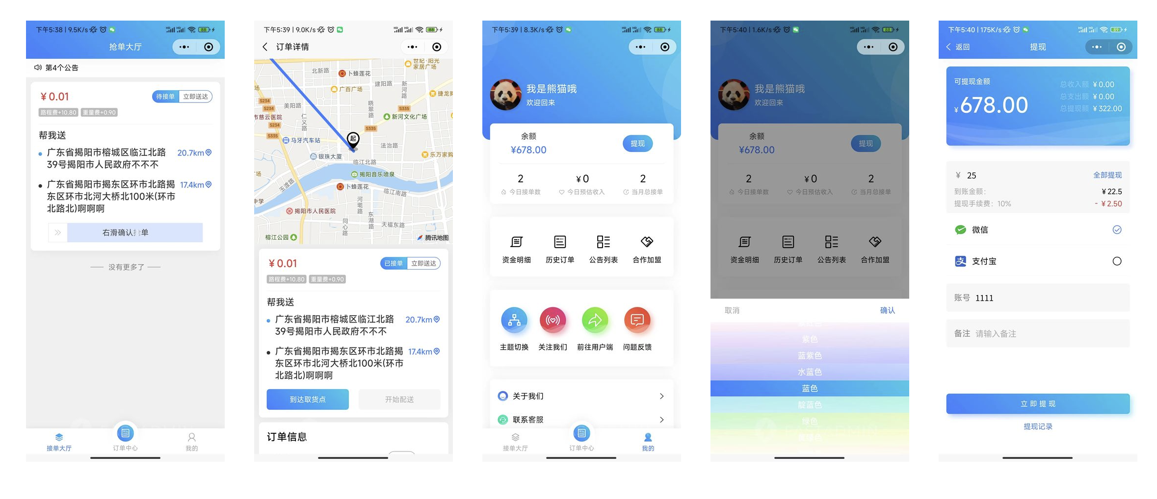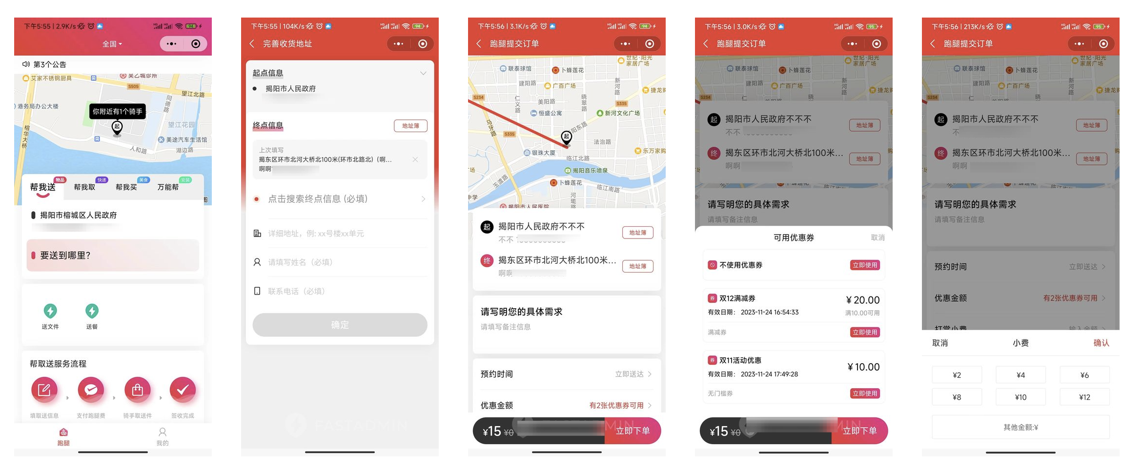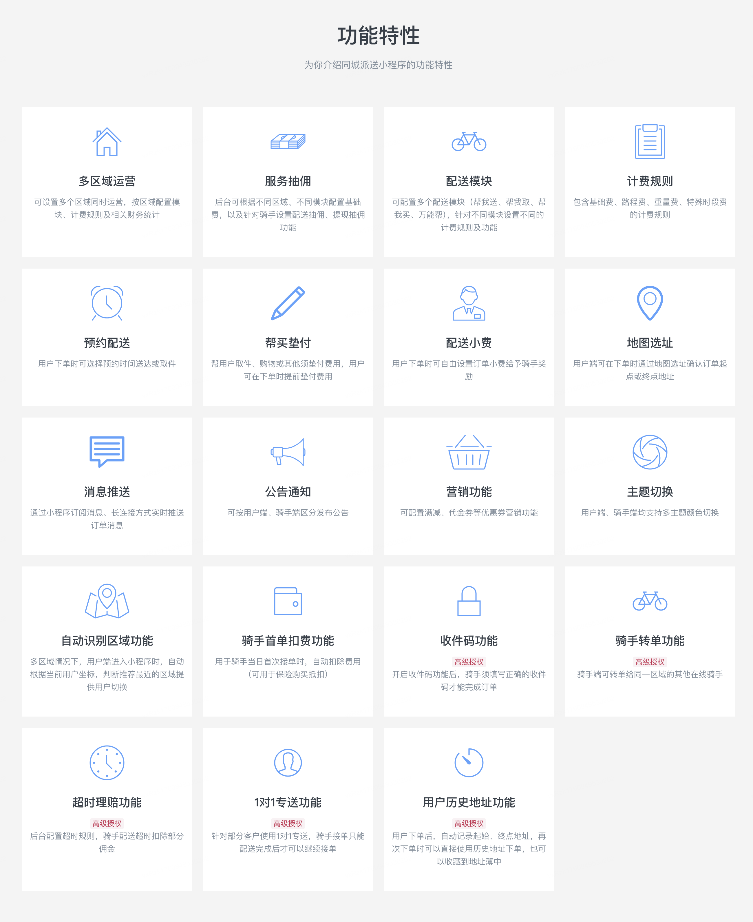 同城配送小程序,包含用户端、骑手端、运营后台,支持基础费、骑手配送抽佣、提现抽佣、多区域运营、财务统计,支持后台指派订单、骑手抢单模式,支持优惠券等营销功能,为跑腿团队提供技术解决方案,无加密源码,可私有化部署。
