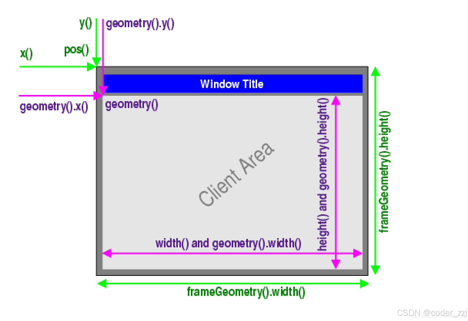 qt界面形成时会自带系统的窗口框架window fram进行填充,导致是要以窗口框架的(0,0)为参照物还是widget窗口(0,0)作为参照物;为了解决这一问题,qt提供了不同的API对应不同参照物产生的效果,比如 geometry()返回的是以widget窗口(0,0)作为参照物,frameGeometry()则是以winodw fram的(0,0)作为参照物