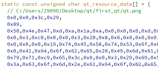 生成的C++代码文件:qrc_resource.cpp中可以看到确实使用了数组保存图片二进制文件