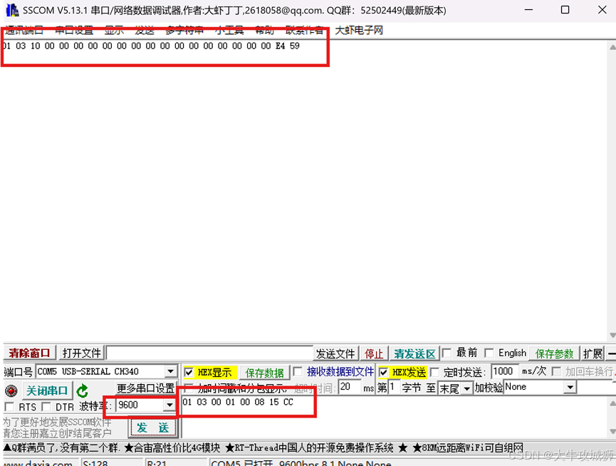 使用电脑模拟485主机进程测试,电脑端运行,sscom5.13.1,打开对485进行电压转换,这里需要借助一根线,连接到电脑。比如USB转485。