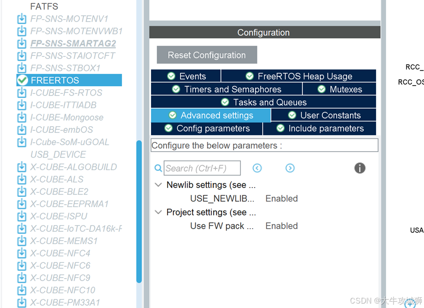 在Advanced settings中USE_NEWLIB_REENTRANT 需要Enabled,不然会又警告提示,项目实际上芯片资源充分,这里选择了使能。这里是否需要使能 USE_NEWLIB_REENTRANT 取决于应用需求。如果需要线程安全且可以接受额外的内存开销,建议启用此选项。如果不需要线程安全或内存资源有限,可以选择不启用,但需避免使用可能引发线程安全问题的函数。