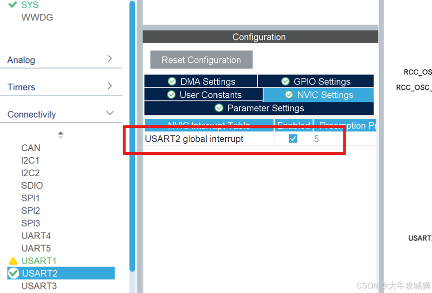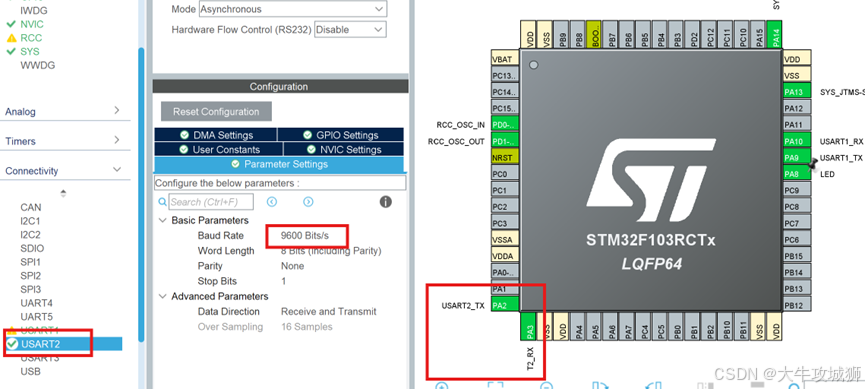 采用uart2作为485串口,波特率选择9600,打开NVIC Settings,是能接受中断。