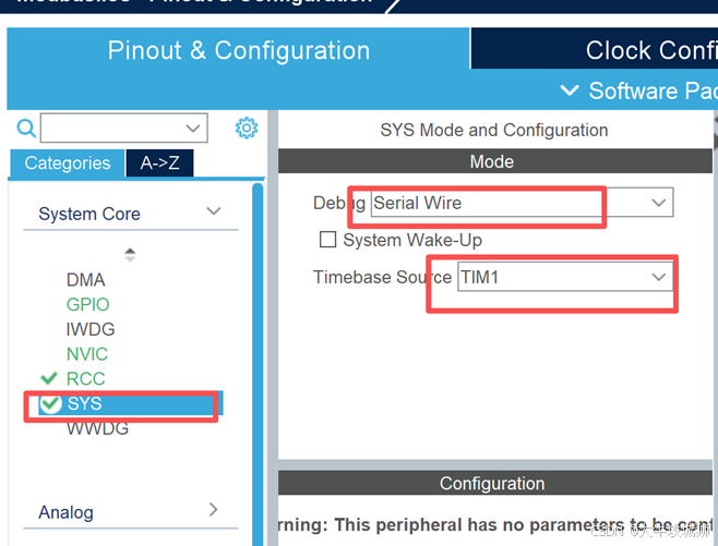 使用freeRTOS可以简化编程,实现多任务编程。首先配置调试接口,可以根据需要配置,这里配置SW接口,这里需要配置Timebase Source为TIM1,避免和HAL库共用了SysTick时钟源。