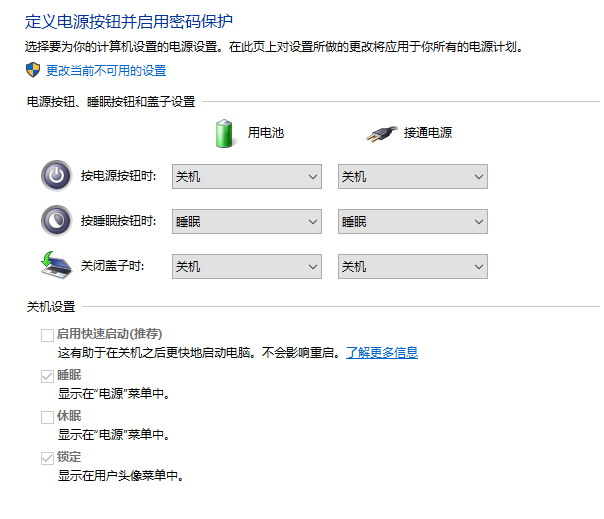 在"系统设置"页面,你可以看到电源按钮和睡眠按钮的设置。