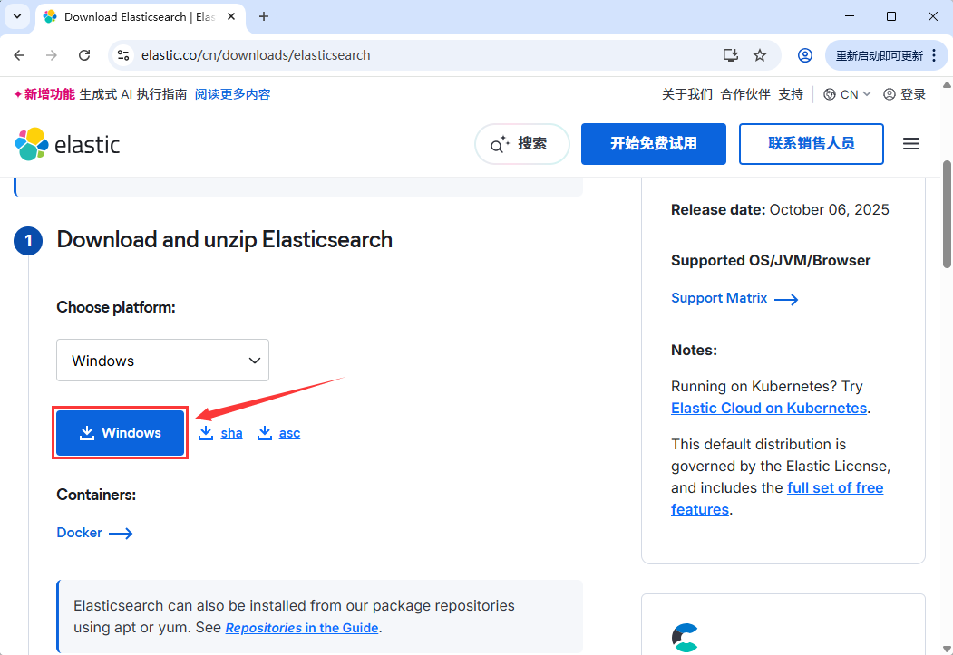 1,本教程操作环境为 Windows11 系统,首先访问 Elastic 官网下载页面,下载 Elasticsearch 的 .zip 版本,点此查看,下载完成将 elasticsearch-版本-windows-x86_64.zip 解压到一个目录,例如 D:\Software\elastic\elasticsearch 。