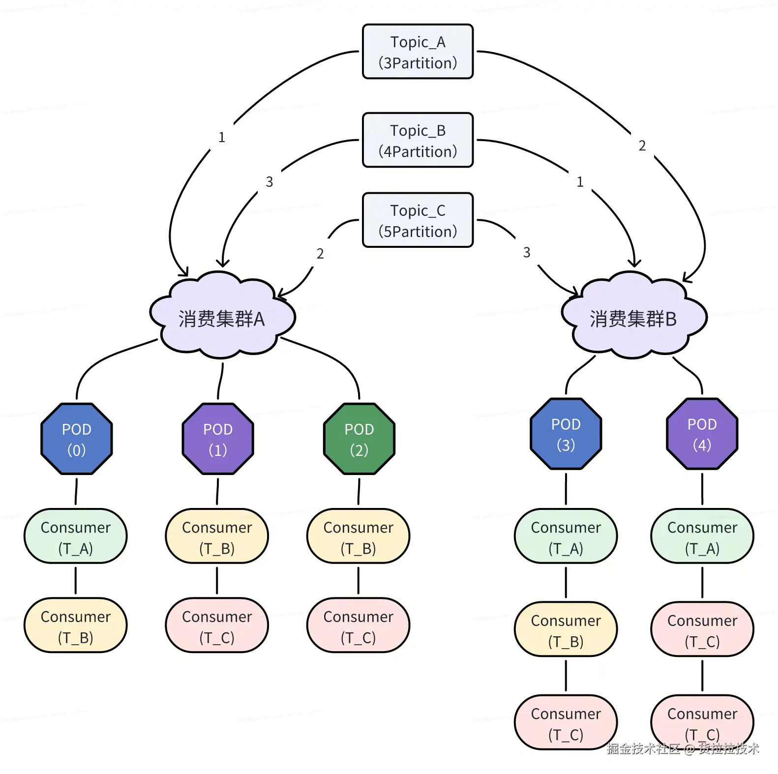 - Topic 与集群的绑定关系:每个 Kafka Topic 被分配到一个特定的消费集群中,一个 Topic 同时仅由一个集群消费。