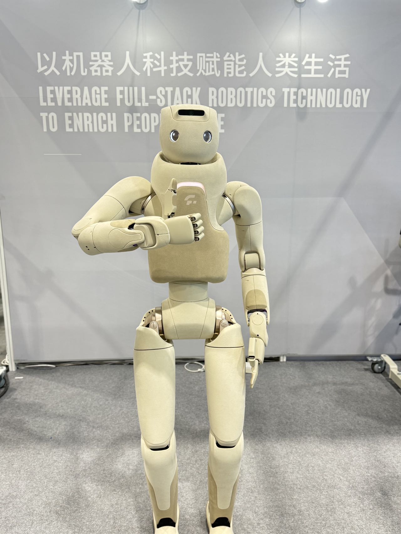 据「TMT星球」了解,展会现场,傅利叶(Fourier)带来了最新款人形机器人 GR-3 与开源人形机器人 N1。GR-3 首次提出 "Care-bot" 概念,创新性融合仿生设计与多模态交互功能,在温暖、拟人、智能的交互体验上实现突破,同时在硬件性能与拟人化表现上完成全方位升级,交互、运动控制和认知表现均贴近人类。N1 则凭借灵动的动态演示惊艳全场------1.3 米身高、38 公斤紧凑机身搭载 23 个自由度,现场完成流畅自然的舞蹈动作。