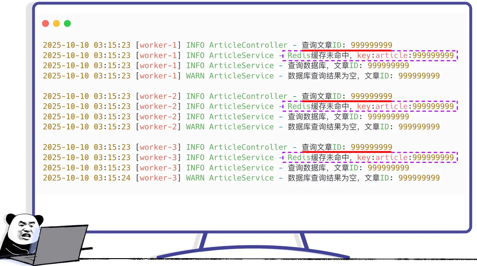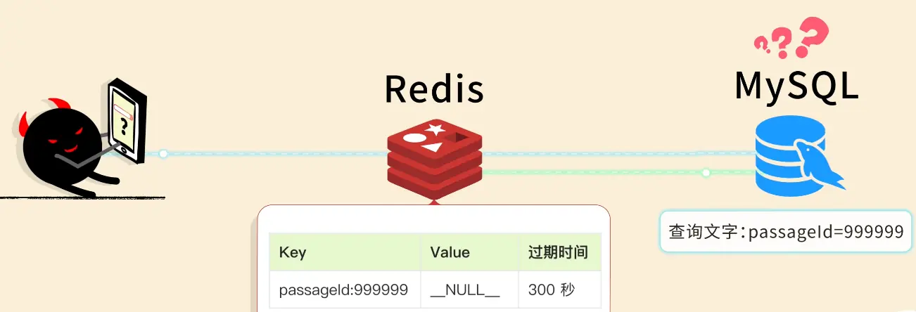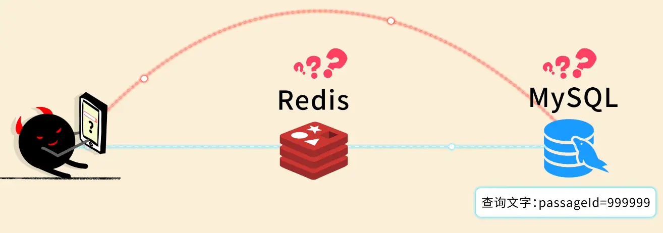 你赶紧去公司看了下日志,发现原来有恶意用户在疯狂查询一个不存在的文章 ID,每次 Redis 缓存中都查不到,请求就直接打到了 MySQL 数据库上!