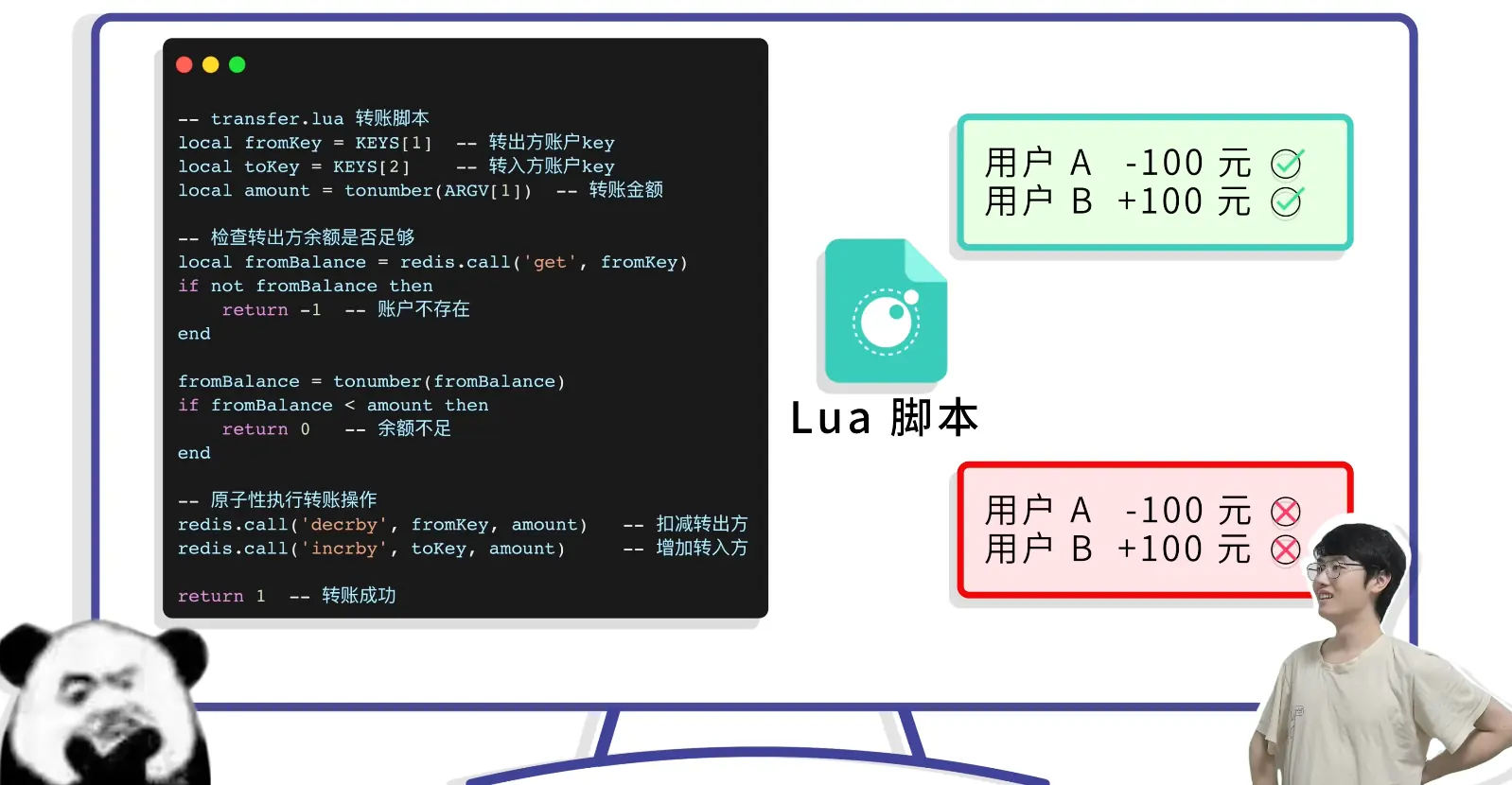鱼皮:对了,还有更高级的玩法,Redis 支持编写 Lua 脚本 保证多个操作的原子性,确保要么全部成功,要么全部失败,避免数据不一致的问题。
