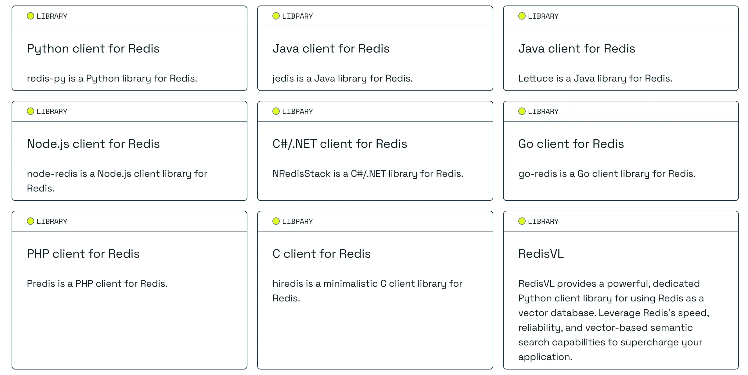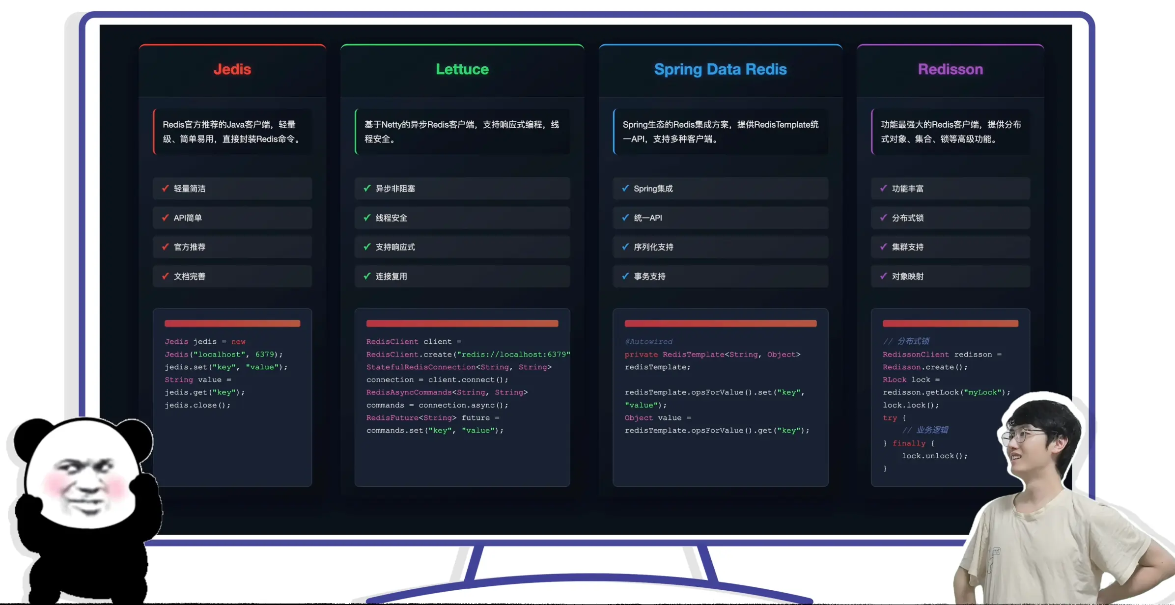 对于 Java 开发者,可以选择 Jedis、Lettuce、Spring Data Redis 和 Redisson,它们封装了很多操作 Redis 的方法,几行代码就能搞定。