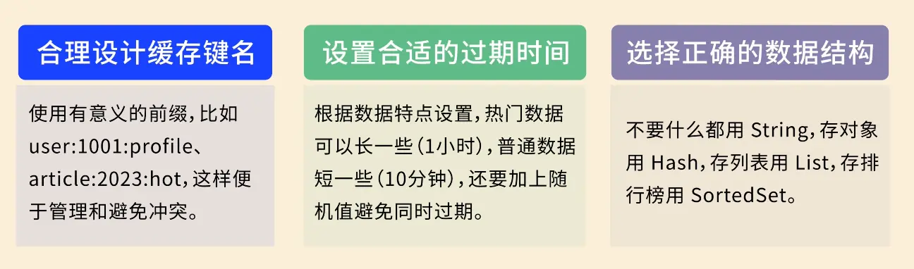 鱼皮:这就是为什么要学习 Redis 的最佳实践,比如合理设计缓存键名、设置合适的过期时间、选择正确的数据结构等等。